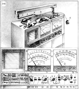 Анализатор двигателя К461: / — стрела; 2 — жгут; 3 — датчик импульсов; 4 — датчик первого цилиндра; 5 — осветитель; 6 — штепсельная вилка; 7 — ом метр-тахометр; 8— комбинированный измеритель; 9 — экран осциллографа; 10— образцы осциллограмм; 11, 12 — контрольные лампы комбинированного измерителя и омметра-тахометра; 13 — лампа «Сеть»; 14 — выключатель сети; 15, 18, 22, 23 — кнопки; 16, 19 — рукоятки; 17 — переключатель омметра-тахометра; 20 — переключатель выбора цилиндров; 21 — переключатель «Программа»; 24 — переключатель числа цилиндров.