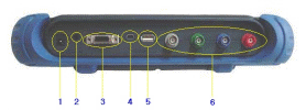 1 – гнездо подключения питания; 2 – RS 232 коннектор; 3 – коннектор для подключения DLC кабеля; 4/5 – USB порт; 6 – порт для осциллографических шнуров