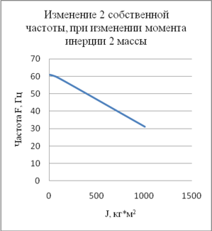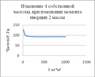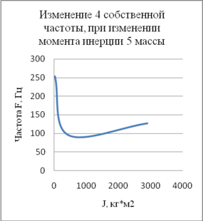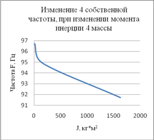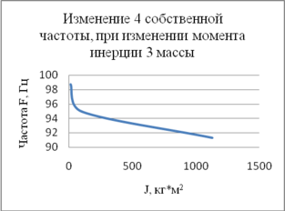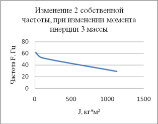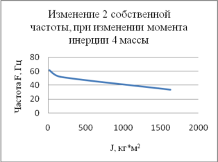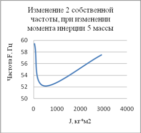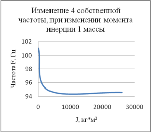 Далее за счет варьирования выбранных параметров получаем в собственном частотном спектре модели значения второй и четвертой собственных частот сначала в два раза меньшие, чем при номинальных параметрах, потом в два раза большие. Изменение параметров элементов осуществляется путем ввода их скорректированных значений. Для этого в главном меню выбирается пункт «Вносим произвольные изменения» и изменяется значение момента инерции выбранных по графикам масс и жесткость связей, оказывающих на изменение этих частот наибольшее влияние. Процесс поиска в соответствии с распечаткой должен быть отражен таблицами следующего вида (на каждом шаге изменения параметров).