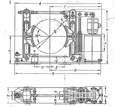 Рис.2.Схема двухколодочного тормаза с длинноходовым электромагнитом.