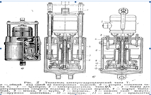 В настоящее время взамен электромагнитов с успехом применяются гидротолкатели, представляющие электронасос с цилиндром, заполненным маслом.