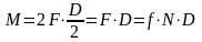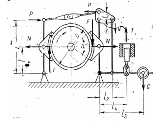 Две колодки 1 и 2, обшитые тормозной лентой, прижаты силами N (с противоположных сторон) к тормозному шкиву диаметром D.