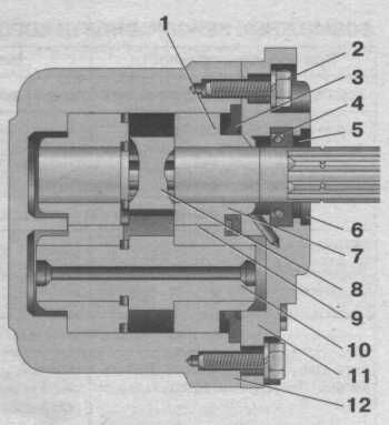 1 - кольцо; 2 - болт; 3 - манжета; 4 - сальник; 5 - опорное кольцо; 6 - стопорное кольцо; 7 - правая втулка; 8 - ведущая шестерня; 9 - левая втулка; 10 - ведомая шестерня; 11 - крышка; 12 – корпус