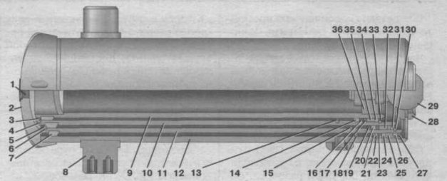 ГИДРОЦИЛИНДР. Гидроцилиндр механизма подъема платформы автомобиля МАЗ-5551 (рис. 6)телескопический,состоит из корпуса 12 и телескопически размещенных в нем трех выдвижных труб 9, 10, 11. Направление выдвижных труб осуществляется полукольцами 4, 6, 7. Ход выдвижных труб ограничивается упорными кольцами 3, 5, 13, 15, 18 круглого сечения. Таким образом, верхние направляющие 25, 32, 35 разгружены от осевых усилий.