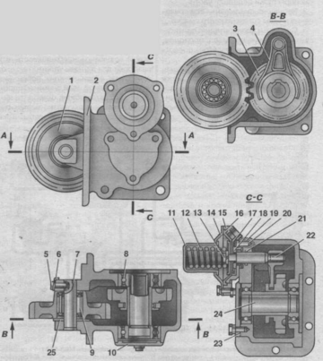 1 - промежуточная шестерня; 2 - картер; 3 - ведомая шестерня; 4 - вилка; 5 - болт; 6 - замковая шайба; 7 - ось; 8 - шариковый подшипник; 9 - роликовый подшипник; 10, 14 - крышки; 11 - стакан; 12 - пружина; 13 - гайка; 15 - пневмокамеры корпус; 16-диафрагма; 17-шайба; 18-упорная шайба; 19, 23, 25-прокладки; 20 - винт; 21 - уплотнительное кольцо; 22 - шток; 24 - шлицевой вал