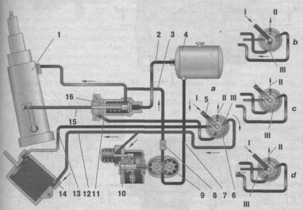 1 -гидроцилиндр; 2, 3, 7 - маслопроводы; 4 - масляный бак; 5 - пневмораспределительный кран; 6 - соединительный канал; 8 - обратный клапан; 9 - масляный насос; 10 - коробка отбора мощности; 11, 12, 13 - воздухопроводы; 14 - пневмоцилиндр управления запорами заднего борта; 15 - тросик перепускного клапана; 16 - перепускной клапан;