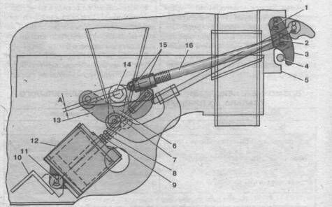 1 - палец крепления захвата; 2 - палец крепления тяги; 3 - захват; 4 - цапфа борта; 5 - кронштейн цапфы борта; 6 - рычаг; 7,11- палец; 8 - вилка; 9 - контргайка; 10 - поперечина крепления пневмоцилиндра; 12 - пневмоцилиндр; 13 - рычаг тяги; 14 - вал рычагов; 15 - гайки; 16 - тяга