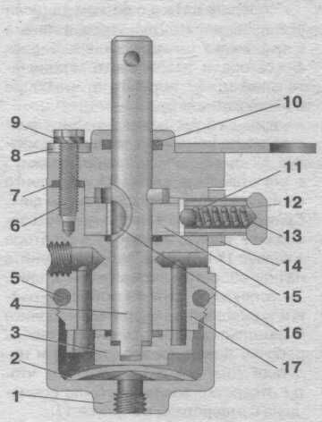 1 - крышка; 2 - тарельчатая пружина; 3 - золотник; 4 - шток; 5, 10 - уплотнительные кольца; 6 - болт; 7 - прокладка; 8 - кронштейн; 9 - шайба; 11 - шарик; 12 - пружина; 13 - корпус пружины; 14 - контргайка; 15-дискфиксатора; 16 - шпонка; 17-корпус