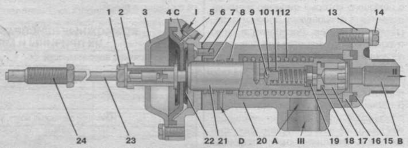 1, 2-гайки; 3-крышка; 4-корпус пневмокамеры; 5-диафрагма; 6- прокладка; 7-винт; 8-уплотнительныекольца; 9-шарик; 10-опора; 11,12-пружины; 13-крышка; 14, 24 - болты; 15 - уплотнительное кольцо; 16 - седло; 17 - золотник; 18 - уплотнительное кольцо золотника; 19 - регулировочная пробка; 20 - корпус; 21 - клапан; 22 - шайба; 23 - тросик; А, В, С, D - отверстия; I - подвод воздуха; II - слив масла; III