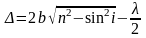 где n – показатель преломления вещества пластинки относительно воздуха, – длина волны света в вакууме (практически и в воздухе). Половина длины волны /2 отнимается потому, что луч 2 в точке С отражается от среды оптически более плотной, чем воздух (n > 1). При этом фаза волны меняется на , что равносильно «потере» половины длины волны. Если i – угол падения лучей 1 и 2, то геометрический расчёт с использованием законов отражения и преломления света позволяет привести выражение (2) к виду