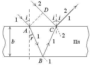 Пусть на прозрачную плоскопараллельную пластинку толщины b падает монохроматическая световая волна длины , которую можно представить как параллельный пучок лучей (рис. 5). AD – фронт волны, 1 и 2 – два параллельных луча из этого пучка. Свет частично отражается от верхней поверхности пластинки, а частично преломляется, проходит внутрь пластинки и отражается от её нижней поверхности.