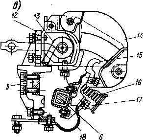 10 - амортизирующие пружины; 11 - сердечник; 12 - изоляционная монтажная колодка; 13 - дугогасительная катушка с магнитопроводом и неподвижным контактом; 14 - дугогасительная камера; 15 - подвижный контакт; 16 - контактная пружина; 17 - контактодержатель; 18 - гибкая связь.