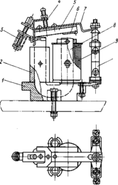 1 - силуминовое основание (заливка), служащее для сборки всего реле и как демпфер; 2- медная гильза-демпфер; 3 - отключающая пружина, регулируемая, 4 – упорная скоба с винтом; 5 - якорь; 6 - немагнитная прокладка; 7-тяга; 8 – U-образный сердечник; 9 - катушка; 10 - узел контактов