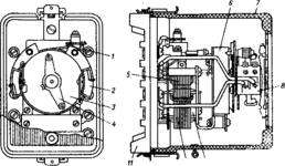 Реле монтируется в пылезащищенном пластмассовом корпусе, состоящем из основания 11 и кожуха 7 из прозрачного материала.