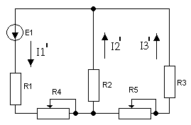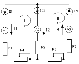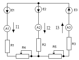 Соберем схему (рис.1) и на основе показаний амперметров замерим токи I1, I2, I3 при поочередном включении источников ЭДС Е1, Е2, Е3. На основании полученных данных заполним таблицу 1.