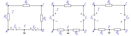 3. Определить силу тока в цепи по закону Ома, указать направление тока в приведённых схемах