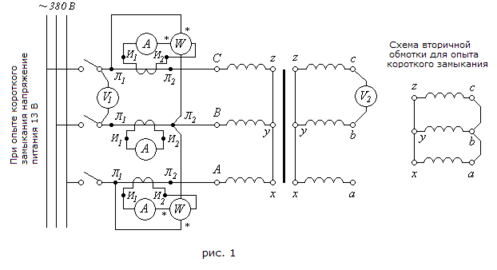 3. Для испытания трансформатора собирается электрическая цепь по схеме, приведенной на рис. 1. К зажимам А, В, С обмотки высшего напряжения подводят напряжение 380 В. Амперметры и токовые обмотки ваттметров включаются через трансформаторы токов.