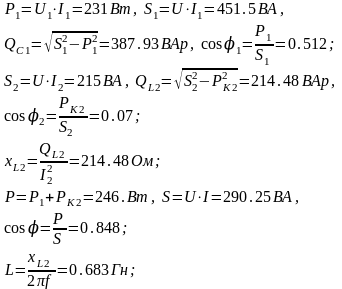 Вывод: при увеличении индуктивности катушки с 130 до 425 мГн сила тока в цепи I и во второй ветви(с катушкой) I2 стремительно падают, при этом косинус угла сдвига возрастает. Реактивное сопротивление катушки меньше сопротивления конденсатора, поэтому через катушку протекает больший ток, чем через конденсатор. В этом случае цепь принимает индуктивный характер и сила тока отстает от напряжения(векторная диаграмма а).