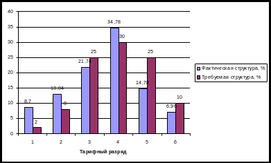 По диаграмме видим, что фактическая структура рабочих перераспределена в сторону низких разрядов по сравнению с требуемой структурой. На лицо нехватка высококвалифицированных кадров.