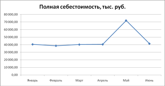 Итак, перейдем к оценке и анализу полученных результатов. Полная себестоимость предприятия за 6 месяцев увеличилась с 40490,2 до 41390,3 тысяч рублей. Динамика роста стабильная. Наибольший рост наблюдался с февраля по март и с апреля по май.