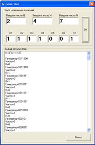 Генератор строится на базе регистра Хi(i=1,n),состоящего из ячеек , в которые записываются целые числа от 1 до g. Случайные числа М- последовательности снимаются с последнего элемента Хn. Числа записанные в ячейки Xm и Xn складываются по модулю g