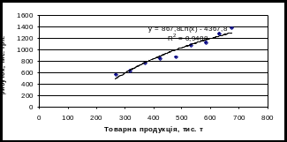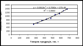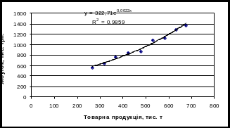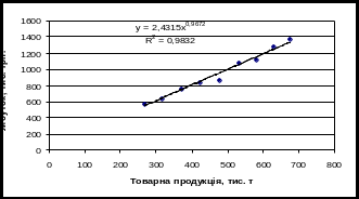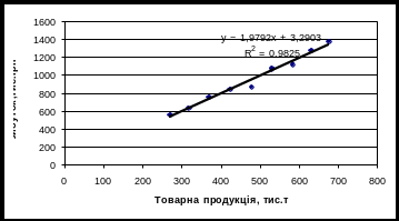 За отриманими результатами можна зробити висновок, що зв’язок між обраними факторами досить значний, так як коефіцієнт апроксимації R2 в середньому дорівнює 0,97. Тобто зміна обсягів товарної продукції призведе до зміни прибутку підприємства.