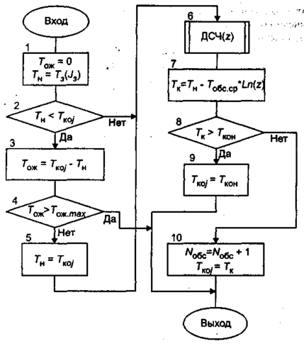 Если канал занят, то оператор 3 определяет время ожидания Tож как разность времени освобождения канала Ткоj и времени поступления заявки T3(J3). Оператор 4 проверяет условие, что время ожидания Тож превышает допустимое Тож.max. Если это условие выполняется, то управление передается на конец процедуры и заявка остается необслуженной.