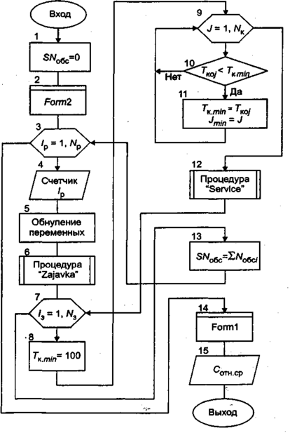 Оператор 12 обращается к автономной процедуре обслуживания очередной заявки. На выходе этой процедуры определяется число обслуженных заявок в выбранном канале Nобс(Jmin).