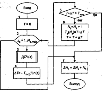 Оператор 4 определяет возможное значение случайной величины времени поступления очередной заявки при условии, что среднее время между соседними заявками равно Тз.cp. Оператор 5 проверяет условие окончания процесса формирования заявок.