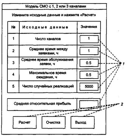 После окончания работы модуля и выдачи на экран результатов моделирования работа процедуры, связанной с кнопкой «Расчет», заканчивается. Программа вновь переходит в режим ожидания действий пользователя.