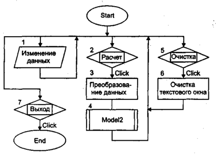 Цифрой 2 обозначено действие, заключающееся в нажатии (с помощью мыши) кнопки «Расчет». В процедуре, связанной с этой кнопкой, оператор 3 осуществляет перевод исходных данных из символьной формы в числовую. Затем оператор 4 обращается к модулю общего назначения «Model2». Схема алгоритма этого модуля приведена на рис. 4.