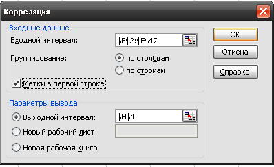 В диалоговом окне анализ данных выберите инструмент Корреляция, а затем щелкнуть на кнопке ОК.