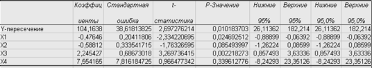 У=104,16 – 0,48Х1 – 0,59Х2 + 2,25Х3 + 7,55Х4
