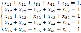 f(x) = 25x11 + 16x12 + 15x13 + 14x14 + 13x15 + 25x21 + 17x22 + 18x23 + 23x24 + 15x25 + 30x31 + 15x32 + 20x33 + 19x34 + 14x35 + 27x41 + 20x42 + 22x43 + 25x44 + 12x45 + 29x51 + 19x52 + 17x53 + 32x54 + 10x55 → min.