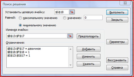 В группе Ограничения заданы, помимо остальных, ограничения на двоичность переменных (первая запись), означающие, что значение xij должно быть 0 или 1. Добавляя ограничения, следует выбрать опцию двоичное в раскрывшемся списке Ограничение.