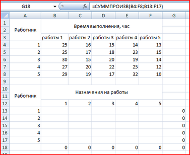 Значения переменных хij располагаются в блоке ячеек B13: F17, в ячейку G18 введена формула для вычисления целевой функции (рис.2.1)