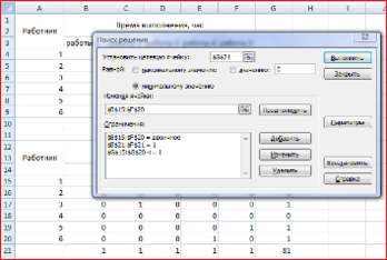 Аналогично вводятся формулы для вычислений ограничений по работникам. На рис.2.2. заполнены все поля Поиска решений.