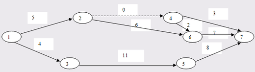 В сетевом графике имеется два основных элемента – работа и событие. Работы соответствуют дугам графа, а события – вершинам. Работами называются любые процессы, действия, приводящие к достижению определенных результатов (событий). В сетевом графике может быть несколько разновидностей работ: действительная работа, ожидание, фиктивная работа. Действительной называется работа, требующая затрат времени и ресурсов. Ожиданием называется работа, которая требует затрат времени, но требует затрат ресурсов. Фиктивная работа отражает логическую связь между работами и не требует затрат времени и ресурсов. Действительные работы и ожидания изображаются на графике сплошными стрелками, фиктивные работы – пунктирными стрелками. Количественные показатели (время, стоимость, ресурсы), характеризующие работу, проставляются над стрелками (рис.2).