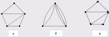 В основе сетевого моделирования лежит изображение планируемого комплекса работ в виде графа. Граф – это схема, состоящая из заданных точек – вершин, соединенных определенной системой линий, которые также называются ребрами или дугами графа. Ребра могут быть ориентированными (тогда они называются дугами и снабжаются стрелками) и неориентированными. Пара вершин может соединяться более чем одним ребром и такие ребра называются кратными. Вершина может быть соединена ребром сама с собой, и такое ребро называется петлей. Имеется несколько типов графов: обыкновенный граф (рис. 1, а), мультиграф (рис. 1,б), ориентированный граф (рис.1,в) и др. граф без дуг, петель и кратных ребер называется обыкновенным. Если граф имеет кратные ребра, то он называется мультиграфом. Обыкновенный граф, у которого все ребра являются ориентированными, называется ориентированным.