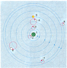 В системе Птолемея (рис.1) Земля (1) покоится в центре мира. Вокруг нее движутся Луна (2), Меркурий (3), Венера (4), Солнце (5), Маркс (6), Юпитер (7) и Сатурн (8); каждое тело движется по малому эпициклу.