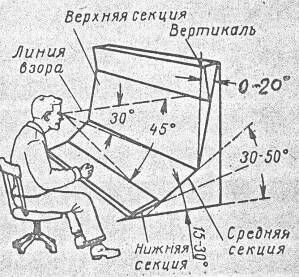 Индикаторы зрительной информации рекомендуется размещать в оптимальных участках поля зрения, которые характеризуются в горизонтальной плоскости углом 30 – 40º и 0-30º вниз от линии взора. Наиболее важные индикаторы располагают на уровне глаз оператора или ниже. Рекомендуемое расположение индикаторных приборов на панелях стендов показано на рис. 2.