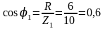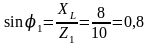 Находим величину угла φ = arccos 0,6 = 53°. Так как во второй ветви включено только емкостное сопротивление ХС, то: cos φ2 = 0; sin φ2 = -1; φ2 = -90°.