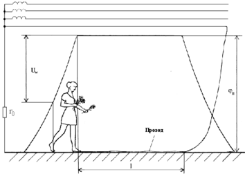 Вблизи упавшего провода потенциалы поверхности земли изменяются, как показано на рисунке.