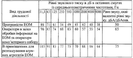 Рівні звукового тиску в октавних смугах частот, рівні звуку та еквівалентні рівні звуку на робочих місцях, обладнаних ПК, мають відповідати вимогам СН 3223–85, ГОСТ 12.1.003–83, ГР 2411–81 (табл. 3).