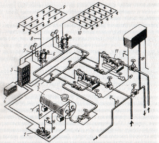 1 — компрессор; 2 — пневмобак; 3 — магистральный трубопровод; 4—приемная станция пожарной сигнализации; 5 — щит управления и контроля; 6 — контрольно-сигнальный клапан; 7—сигнализатор давления; 8 — питательный трубопровод; 9—оросители (спринклеры); 10—распределительный трубопровод; 11— центробежный насос