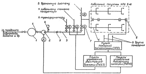Принципиальная схема установки водяного пожаротушения приведена на рисунке: