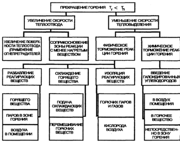 Способы прекращения горения, основанные на принципе охлаждения реагирующих веществ или горящих материалов, заключаются в воздействии на них охлаждающими огнетушащими веществами; основанные на изоляции реагирующих веществ от зоны горения – в создании между зоной горения и горючим материалом или окислителем изолирующего слоя из огнетушащих материалов и веществ; основанные на разбавлении реагирующих веществ или химическом торможении реакции горения – в создании в зоне горения или вокруг нее негорючей газовой или паровой среды.
