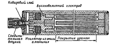 По сравнению с борными счетчиками камеры деления более долговечны и могут работать при высокой температуре. Эффективность камер деления с 235U равна 0,6%, те значительно ниже, чем для борных счетчиков. Для увеличения чувствительности камер деления к нейтронному излучению необходимо увеличить поверхность электродов камеры. Камера деления с высокой эффективностью имеющая четыре концентрических алюминиевых электрода показана на рис6.