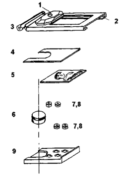 1 — бета-дозиметр, 2 — крышка кассеты индивидуального дозиметра ГНЕЙС, 3 — булавка, 4 — целлулоид, 5 — фотография с инициалами и фамилией, 6—дозиметр промежуточных и быстрых нейтронов, 7 — дозиметры γ~излучения, 8 — дозиметры тепловых нейтронов, 9 — корпус кассеты индивидуального дозиметра ГНЕЙС.