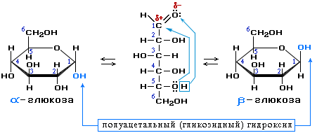 В α-глюкозе этот гидроксил находится в транс-положении к гидроксиметильной группе -СН2ОН, в β-глюкозе – в цис-положении.